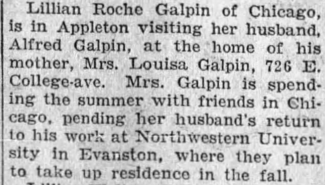 Again, speculation rears its head: if Lillian was living and working in Chicago, she probably was either living with family or had a lease on an apartment, and Alfred was probably in much the same situation in Appleton, although probably staying at the family home; perhaps Alfred would live with or visit Lillian in Chicago between terms until her lease was up, as they sought a more permanent solution.