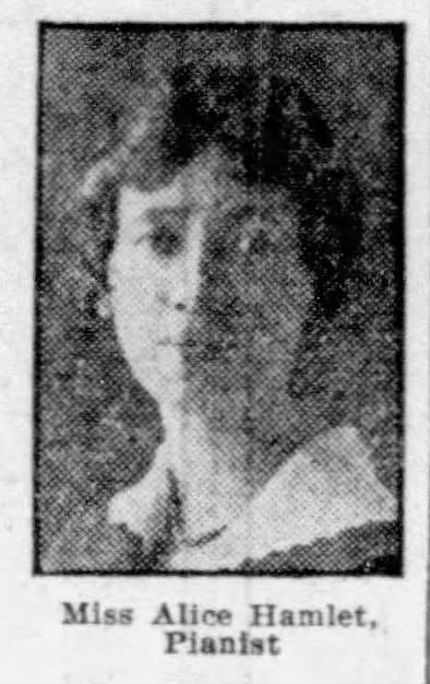 I didn’t dig that far into the Hamlet/Harrington ancestry – pretty much just far enough to confirm Eva’s relation – just as I didn’t go into great detail about Alice Hamlet in later life (there’s a newspaper clip about her being robbed at knife-point, and an Alice Hamlet Competition held by the New England Piano Teacher’s Association to this day that are both interesting tidbits). I wish I had a better handle on her amateur career, but lacking back issues of 100+ year-old ajays, its hard to say much about it.