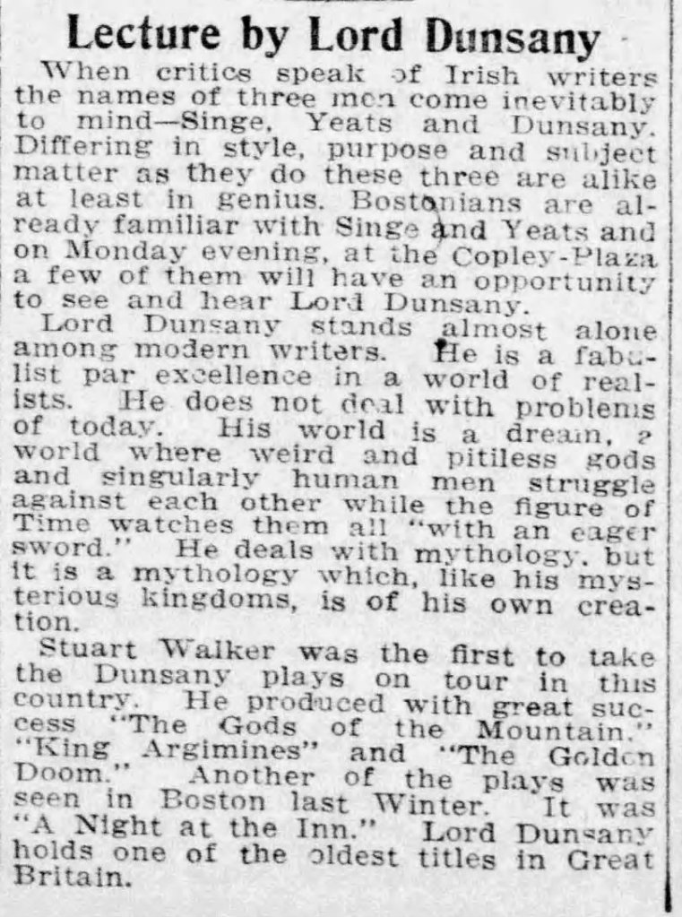 At 7:00 a party consisting of Miss H., her aunt, young Lee, & L. Theobald set out for the great event. Arriving early at the Copley-Plaza, we obtained front seats; so that during the address I sat directly opposite the speaker, not ten feet from him. Dunsany entered late, accompanied & introduced by Prof. George Baker of Harvard. […]