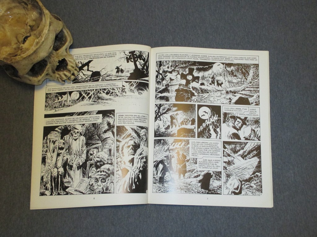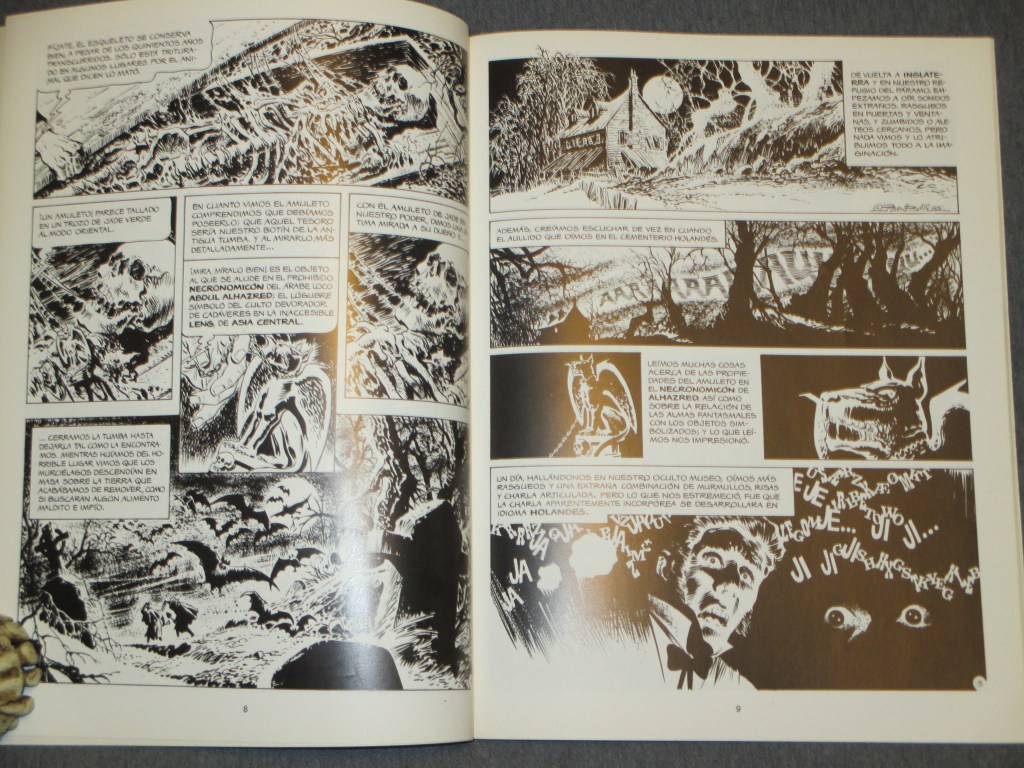 | Hay quienes consideran el género de TERROR como un subproductio. Es cierto que, como en todo, a veces domina una calidad ínfirma, pero no sólo en los Comics. También en cinema, televisión, literature… Tal vez porque el tema se ha explotado a fondo con abusos commerciales aprovechando que a la gente le gustan las emociones fuertes y muchos, sin saberlo, las utilizan para liberarse de sus propios miedos. Pero también es cierto que otros se han servido de sus miedos para expresar sus sentimientos y emociones segun su condición psicológica dando lugar a las mejores obras del género. Tal as el caso de POE, LOVECRAFT, KAFKA, y muchos más. El experto en la materia no dejará nunca de reconocer que el TERROR es un tema de gran interés que además nos revela la personalidad más intrínseca de sus autores. Por eso, repito, el TERROR no se debe subestimar a la ligera sin un previo análisis. Conociendo lo suficiente (presumo) sobre la vida atormentada y la obra de Los maestros del terror, he seleccionado una serie de relations pasándolos al Comic, Bien adaptando fielmente algunos, Bien dando mi toque personal a otros. Y aquí está el resultado: Este libro con el que deseo rendir homenaje a los «GRANDES DE LO MACABRO». Espero que lo pasen de miedo. | There are those who consider the TERROR genre as a by-product. It is true that, as in everything, sometimes a low quality dominates, but not only in Comics. Also in cinema, television, literature… Perhaps because the topic has been thoroughly exploited with commercial abuse, taking advantage of the fact that people like strong emotions and many, without knowing it, use them to free themselves from their own fears. But it is also true that others have used their fears to express their feelings and emotions according to their psychological condition, giving rise to the best works of the genre. Such is the case of POE, LOVECRAFT, KAFKA, and many more. The expert on the subject will never fail to recognize that TERROR is a topic of great interest that also reveals the most intrinsic personality of its authors. Therefore, I repeat, TERROR should not be underestimated lightly without prior analysis. Knowing enough (I presume) about the tormented life and work of The Masters of Terror, I have selected a series of relations, transferring them to the Comic, either faithfully adapting some, or giving my personal touch to others. And here is the result: This book with which I wish to pay tribute to the “GREAT OF THE MACABRE.” I hope you have a scary time. |