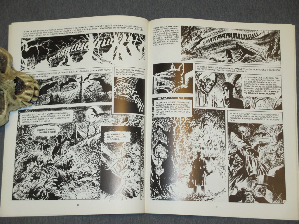 “La Maldicion del Amuleto” is an adaption of H. P. Lovecraft’s “The Hound.” In Spanish, the story is typically translated as “El Sabueso,” and while there are many words for dog in Spanish (perro, can or canino, cacharro (“puppy”), chandoso, etc.) “sabueso” has the specific meaning of a hunting dog; we might even say “bloodhound” in English. Which is a nice shade of meaning, given the context.