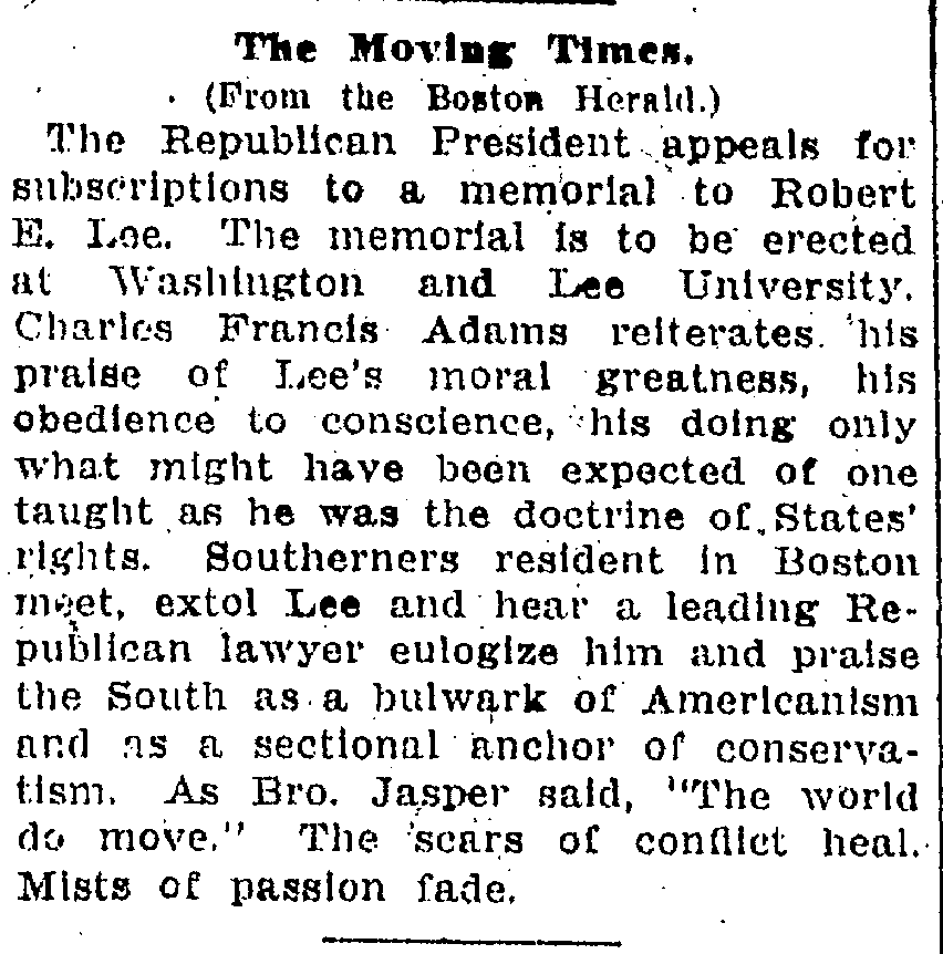 Memorials to Lee were not entirely lacking; Washington College was renamed Washington and Lee after Lee’s many years of service there, and the University Chapel (formerly the Lee Chapel) contains the remains of Robert E. Lee and many of his immediate family. The announcement stirred emotions, since the Confederates were traitors and fought for the cause of slavery. Charles F. Janes wrote a letter to the editor in response.