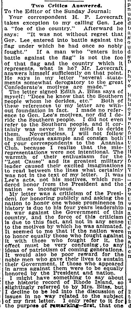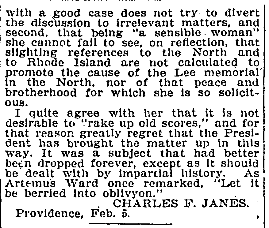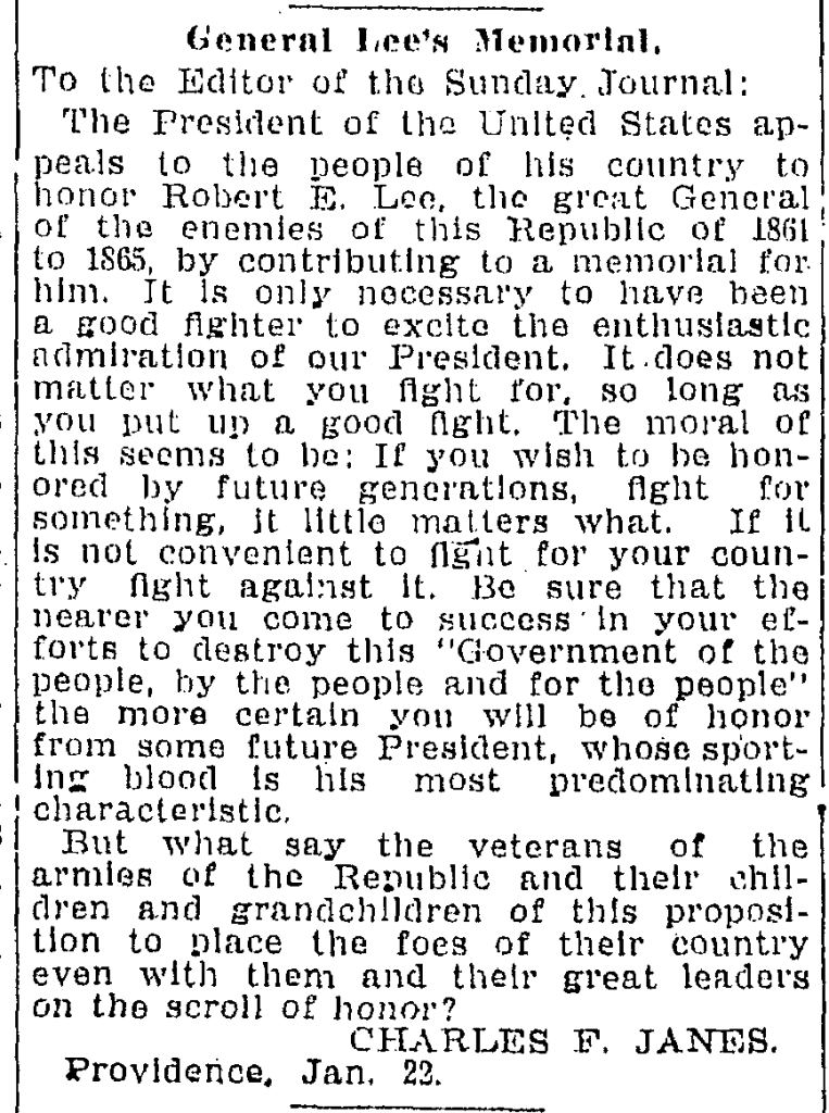 Lovecraft was not alone in his support of Robert E. Lee and the proposed memorial; a Mrs. Bliss also had a letter published in support in the same edition. In the 7 Feb 1909 edition of the Providence Journal, three letters were published that responded to these. While all of them were indirectly addressing Lovecraft’s points, only one, that by Charles F. Janes, named Lovecraft explicitly: