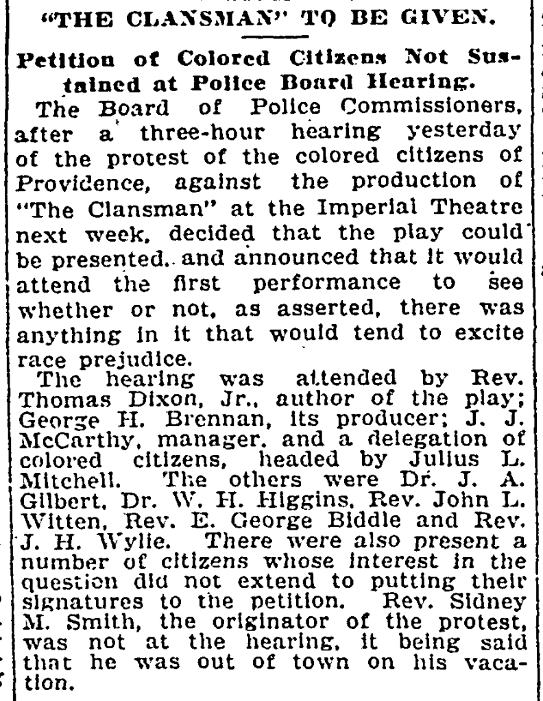 The Clansman was performed in Providence, despite the protests of BIPOC citizens. Lovecraft had read the novel, and saw the play (when exactly we don’t know, but quite possibly during Sep 1909). In a letter to the editor of the Providence Journal, Lovecraft wrote about The Clansman. The letter was published in the 26 Sep 1909 edition: