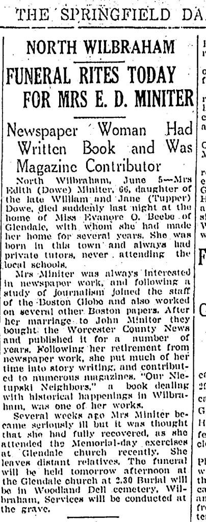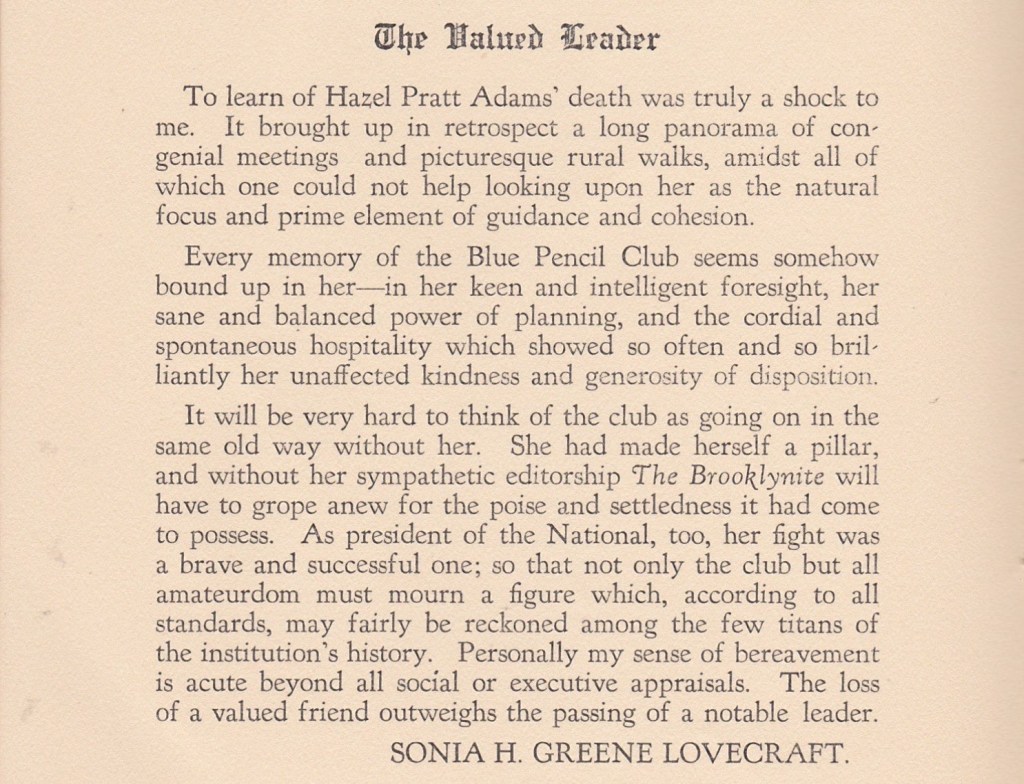 Because so much of the surviving correspondence is between Lovecraft and her husband, it is difficult to get a bead on Muriel E. Eddy’s relationship with Lovecraft. There is a strong impression that at the beginning (c.1918-1924), Lovecraft was writing mostly to Muriel, as he would to any of a number of amateur journalists. As Lovecraft’s business with C. M. Eddy, Jr. waxes—first with revising his work and getting stuff typed, then the Houdini-stuff, and finally the Bishop revising/typing—we see less and less of Muriel.