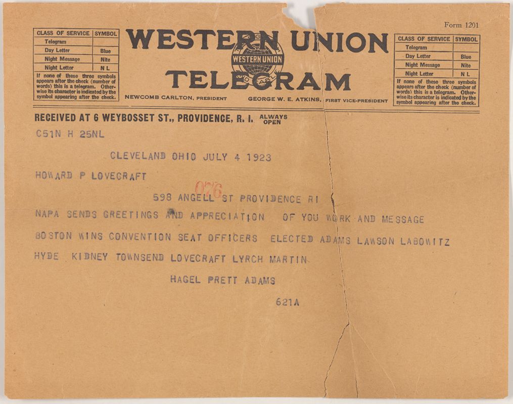 There is a gap in the extant Lovecraft-Eddy correspondence; this is no doubt due in part to Lovecraft’s elopement with Sonia H. Greene to New York in March 1924. Muriel wrote that she saw the announcement in the paper where Lovecraft advertised for the typescript of “Imprisoned with the Pharaohs” (for Harry Houdini), which he had lost on the trip: