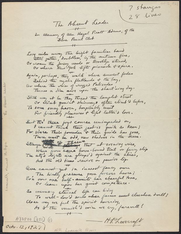 The 20 October 1923 letter opens “My dear Mrs. Eddy:—” and an enclosed story revision—”The Ghost-Eater” for C. M. Eddy, Jr. (which would be published in Weird Tales Apr 1924). The fact that Lovecraft is addressing this business matter through Muriel may suggest that she was the primary point of contact, at least at first, although as with the case of Fritz and Jonquil Leiber, perhaps Lovecraft alternated letters between the two, keeping up a parallel correspondence. The letter goes on to thank her for her comments related to The Poetical Works of Jonathan E. Hoag (1923), which Lovecraft had edited and written the critical preface to.