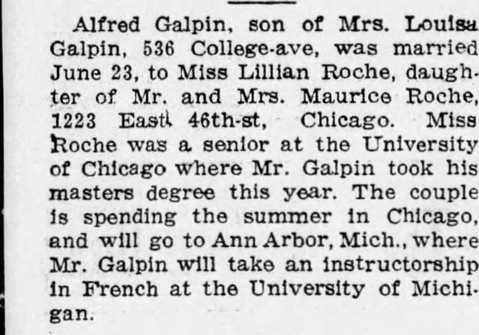 According to census data, birth records, and her gravestone, Lillian Mary Roche was born on 16 Nov 1903 in Lowell, Massachusetts, one of six children of Irish immigrants Maurice and Elizabeth Roche. Her family was living in Chicago, IL in the 1920s, and Lillian was attending the University of Chicago and in the final year of her undergraduate degree when she married Alfred Galpin, then finishing his master’s degree at the same university. The marriage occurred on 23 June 1924, and initial prospects did not appear to be poor—Alfred was fluent in French and had a position as an instructor in that language at the Univeristy of Michigan secured. It would end with Lillian’s death in 1954…and as far as public records go, there is little to add to that. The Galpins had no children, and if Lillian left any record, it has not been published.