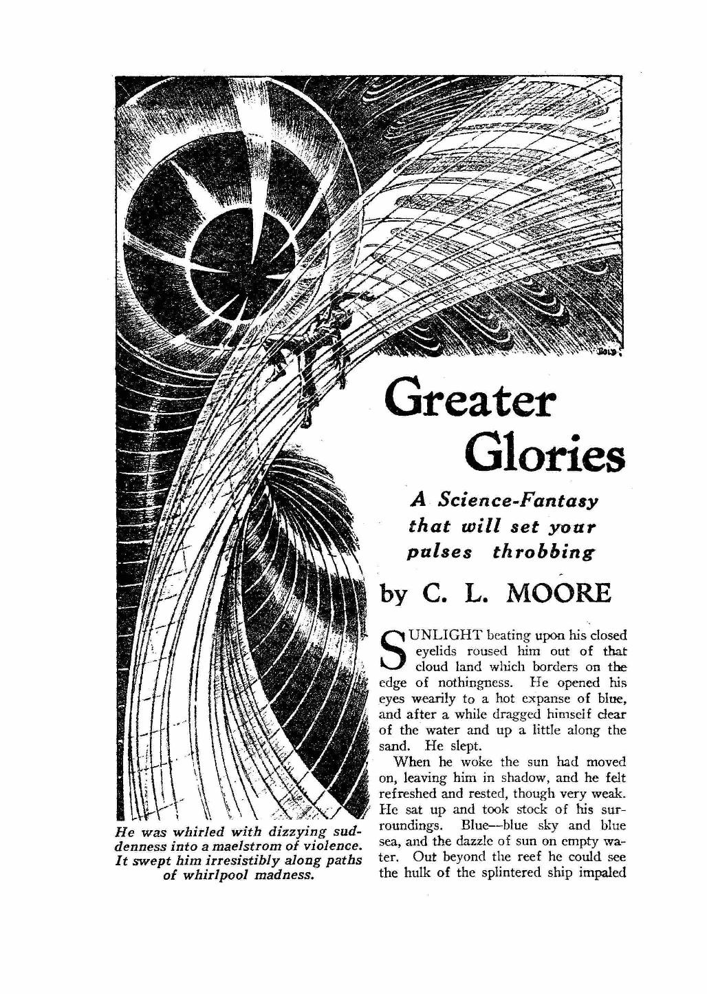 —Forrest J. Ackerman to C. L. Moore, 31 Jul 1935Haven’t you read that story you wrote, GREATER GLORIES? How could ever just a girl write such! Why, you make my English become just gibberish, trying to discuss it. Are you indeed not an Other World Entity, taken on a feminine form to come to earth and astound the senses of, say, a Scientifictionist? Cather, how could you write such a story as GREATER GLORIES?