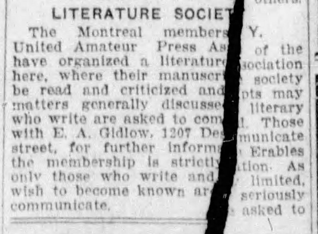 Given that Gidlow’s autobiography was published about 70 years after the events in question, she may be forgiven for forgetting a few of the finer details. The letters in question actually appeared in 1916, and by 1917 she was already Second Vice-President of the United Amateur Press Association of America: