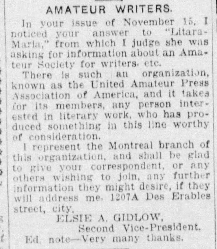 A couple years later, Elsie A. Gidlow became involved with amateur journalism: