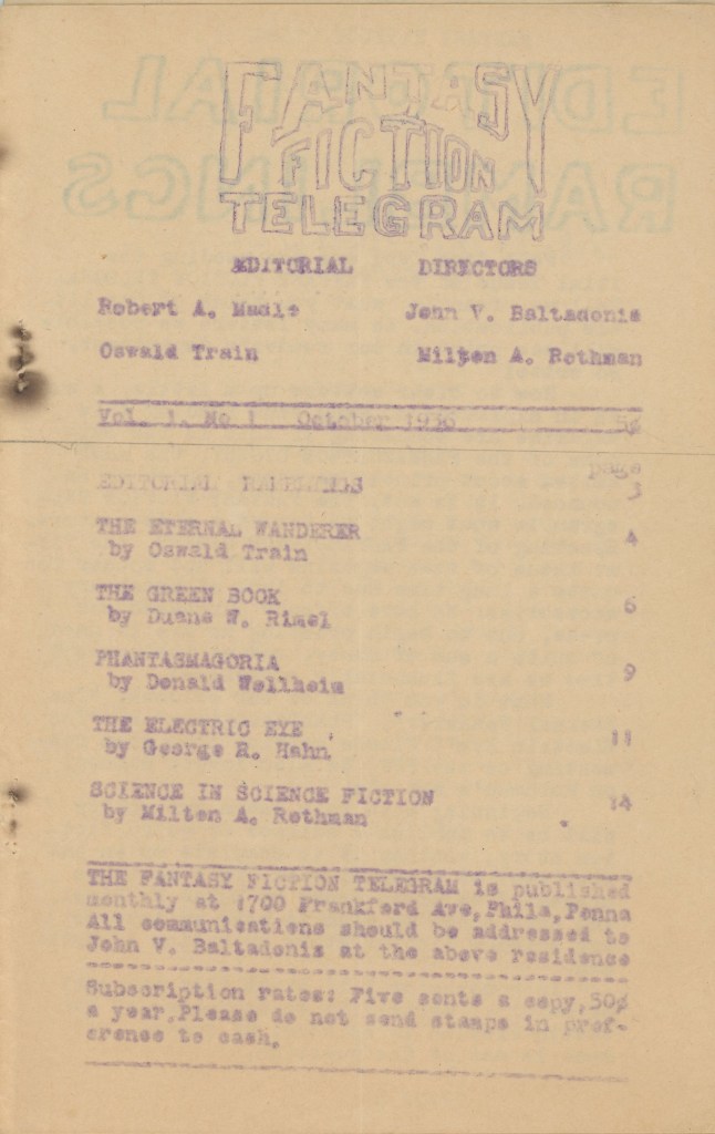 The Fantasy Fiction Telegramwas the organ of the Philadelphia Science Fiction Society. Fanzines of the period were often produced by amateur printers, who could not afford traditional letterpress printing and made use of cheap printing methods such as spirit duplication, hectograph, and mimeograph. All of these printing methods had their advantages (typically, low cost for set up) and drawbacks: