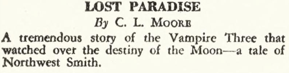 In the context of 1930s pulp fiction, “Lost Paradise” is a variation of the “Lost Race” or “Lost World” plot; the only difference is that instead of physically traveling to some isolated valley, cavern, island, or moon, Northwest Smith and Yarol are sent back in time—mentally, at least, a bit like Lovecraft’s Great Race of Yith in The Shadow out of Time (Astounding Stories Jun 1936).