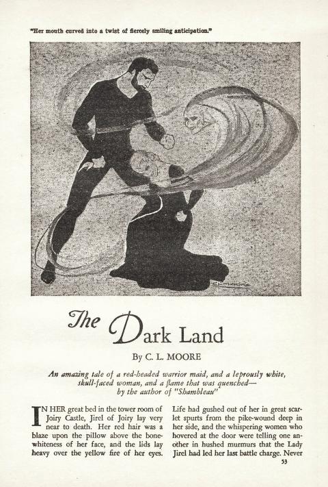 Glad you liked “The Dark Land”. I made the drawing a long time ago, and wrote the story so I could bring it in, with the addition of a cadaverous head and a swirl of vagueness. —C. L. Moore to H. P. Lovecraft, 30 Jan 1936, Letters to C. L. Moore and Others 108