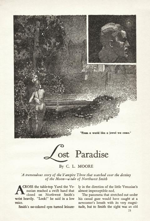 C. L. Moore is an extremely gifted young woman of 25—a fact as well as fiction writer. Her stories are rivaled (now that Bob Howard is dead) only by Klarkash-Ton’s, & contain a highly unique element of convincing unreality—which could be still better but for a certain stereotyped romanticism & occasional concession to the pulp ideal. —H. P. Lovecraft to Virgil Finlay, [25 Sep 1936], Letters to Hyman Bradofsky & Others 447