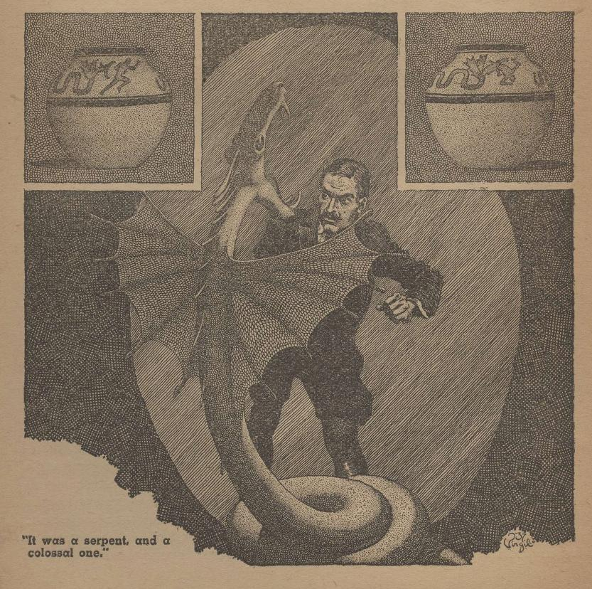 G. W. Thomas has described “The Ho-Ho-Kam Horror” as “an unnoticed Cthulhu Mythos sequel” (Snake Gods & Were-Serpents), and he’s largely correct. Dedicated fans recognized the reference to Yig at least as early as the 1950s, when George Wetzel included it in one of the listings in his TheLovecraft Collector’s Library (1955); the story is also listed in Chris Jarocha-Ernst’s mammoth A Cthulhu Mythos Bibliography & Concordance(1999). However, the story has never been reprinted outside of its original appearance, not in a random Mythos anthology or anywhere else, contributing to its overall obscurity and lack of recognition.