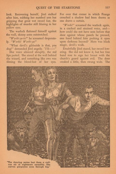 Moore: I’d forgotten that I maybe like “Quest of the Star Stone ” least—that doesn’t mean dislike. If I said so, I expect it’s true. And if true, my guess would be that in this first Kuttner/Moore collaboration the machinery of working together had to be refined and worked over more before it functioned well. Hank and I had met, I think, a short time before this. Or had we met at all? Or only corresponded? Anyhow, he was urging me to do another Jirel and sent on a kind of opening situation to see if I would feel any interest. I did and we sent the ms. back and forth to the best of my very dim recollection until we were ready to submit it. Remember this was all 40 years ago and a lot has happened since.