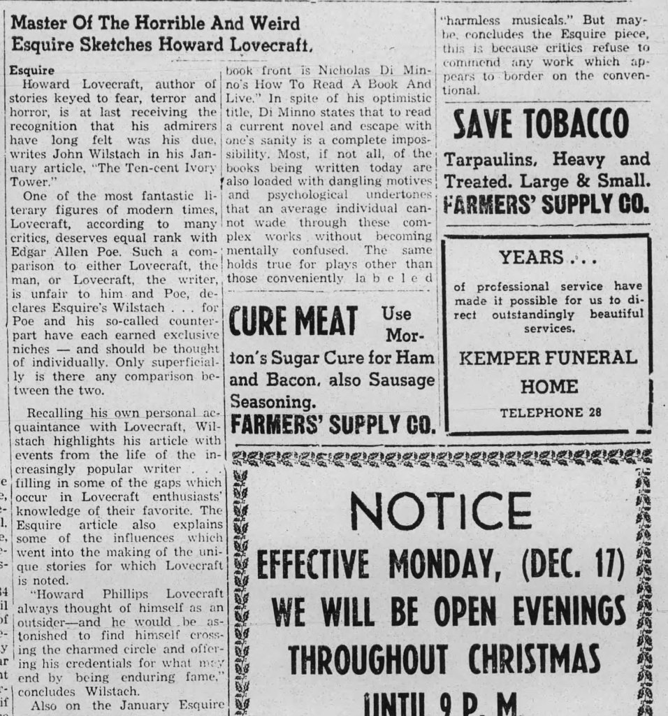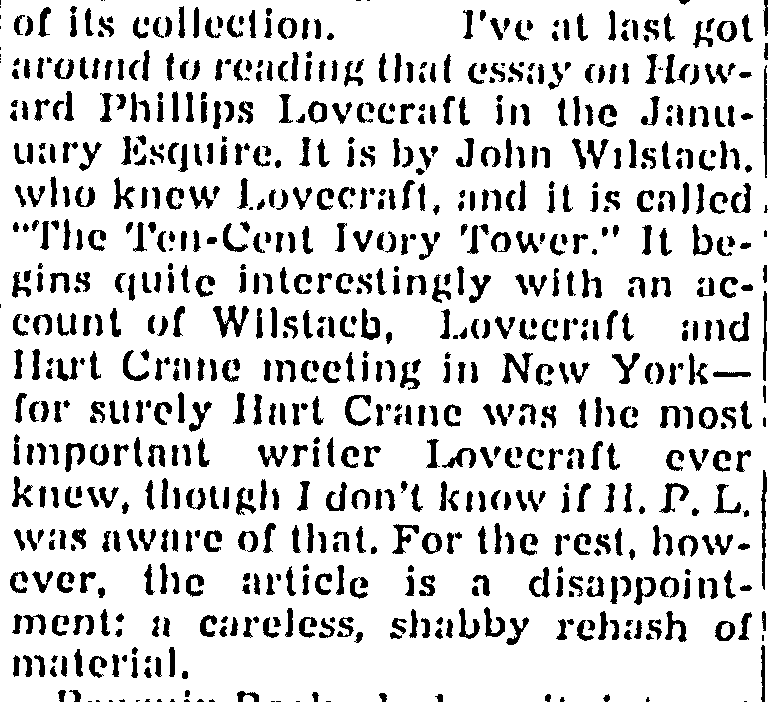 Your information is interesting. Some of my readers informed me there was a “business” being built up about the “cthulhu mythos”. I understand Esquire has purchased an article about Lovecraft hinting such a buildup. You see, I am not without foundation for that idea. […]