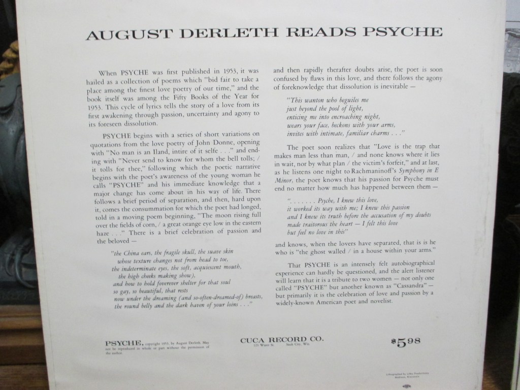 This is a pity as such works provide, if nothing else, an interesting study of the importance of historical context. Derleth’s 1953 collection of love poetry Psyche is a good example.