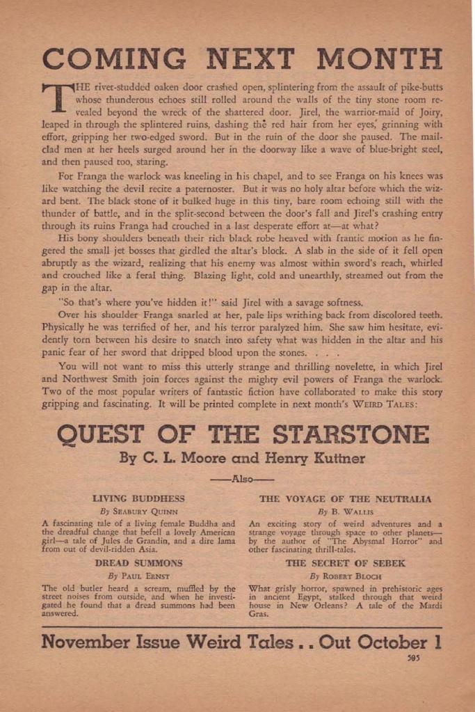 The reference to “Lovecraft’s story of the men from Pluto” is a bit bizarre; as near as I can tell this has to be a reference to “The Whisperer in Darkness” (Weird Tales Aug 1931), which featured the Fungi from Yuggoth. Who were about as far from the stereotypical 1950s humanoid aliens as one might imagine—but this is a good example of a typical misreading or misunderstanding. I wonder how many science fiction fans wondered where they could read about Lovecraft’s men from Pluto?