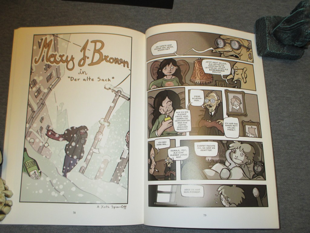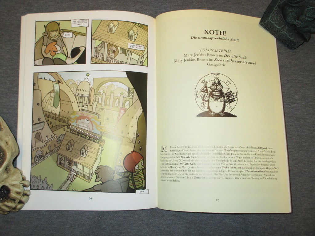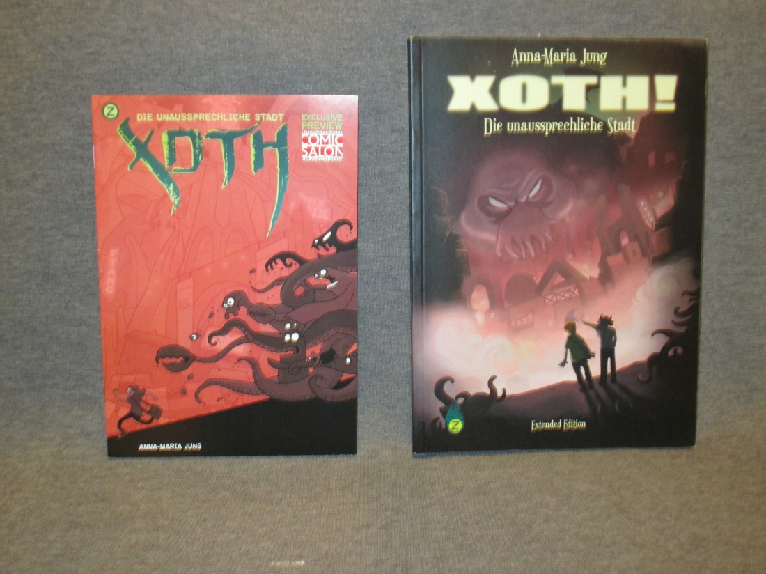 A 2008 “exclusive preview” of Xoth for the Internationaler Comic Salon Erlangen 2008, where the book presumably premiered; Jung also wrote and drew a spin-off comic titled “Marie Jenkins Brown: Sechs ist Besser als zwei” (“Mary Jenkins Brown: Six Is Better Than Two”) published in Comicgate Magazin #3 (2008). Both Xoth! and the Marie Jenkins Brown spin-off were collected and published in the Xoth! Die unaussprechliche Stadt Extended Edition (2010, Zwerchfell Verlag).