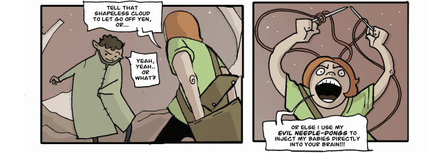 There is a slightly cartoonish, early-2000s webcomic vibe to Jung’s art style, which might make some folks to confuse Xoth! for a comic intended for kids at first glance, but really this is aimed at a more mature audiences, with references to alcohol and sex, and some brief cartoon nudity that is designed to amuse rather than titillate. It’s a fun takeoff of the Mythos for grown ups, especially grownups who were monster enthusiasts in their youth.