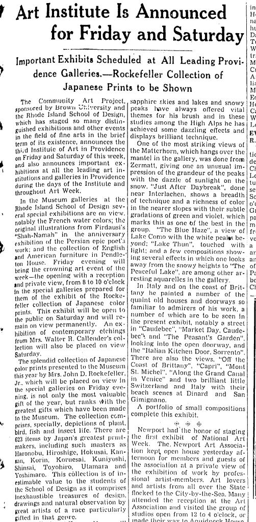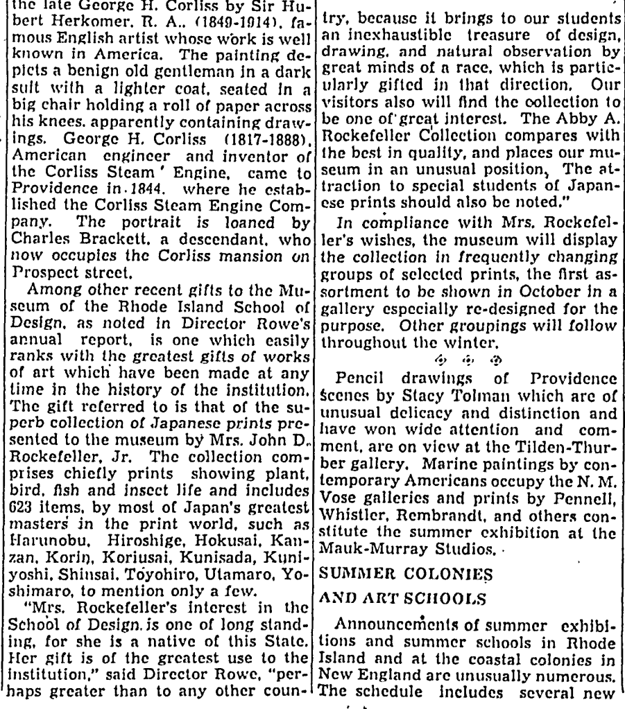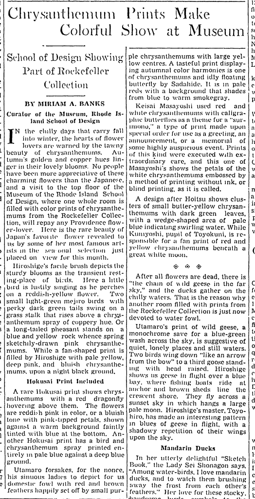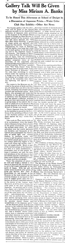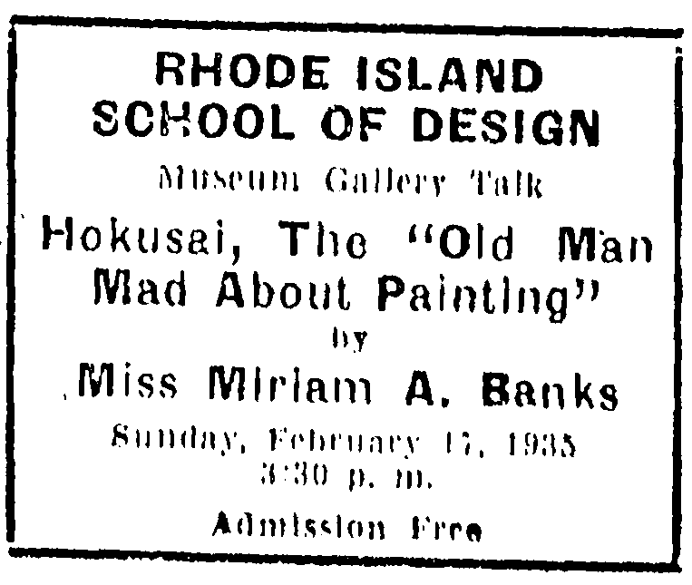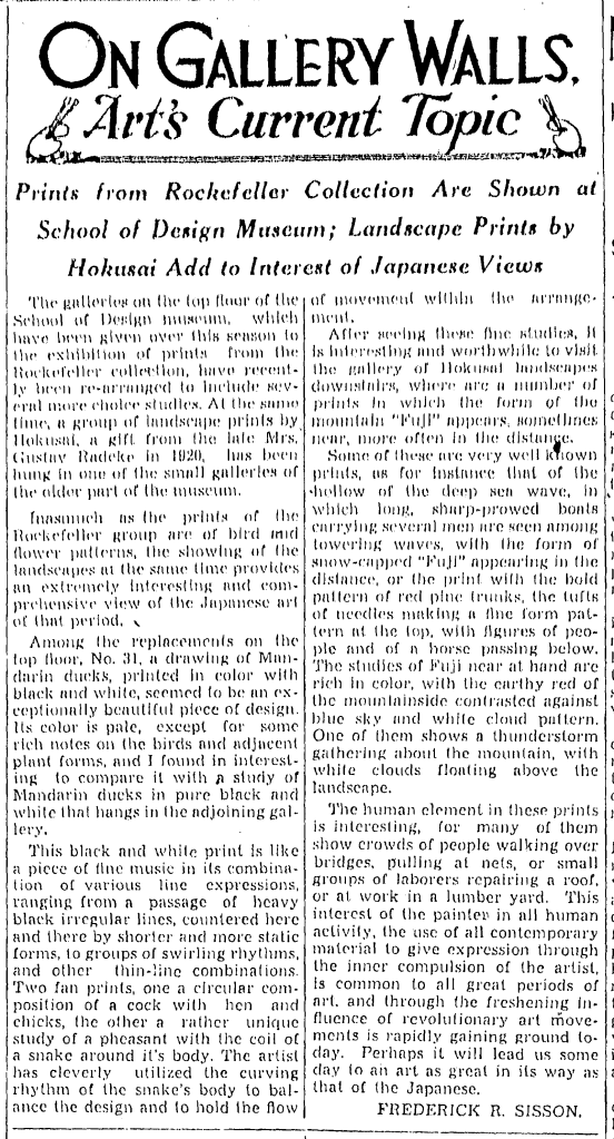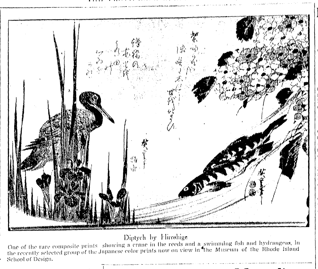 By the 1930s, Japanese prints collections were being displayed in U.S. museums, and the names of popular and notorious artists like Hokusai Katsushika (葛飾 北斎, 1760-1849) and Hiroshige Utagawa (歌川 広重, 1797-1858) were being bandied about by newspapers. In June 1934, Providence native Abby Aldrich Rockefeller (wife of John D. Rockefeller, Jr.) donated her collection of Japanese prints to the Rhode Island School of Design.