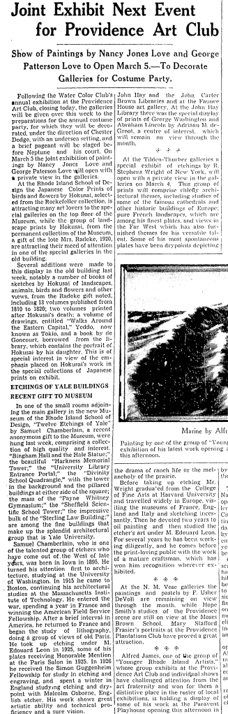 Another event was the display of the choicest of the 717 Japanese prints just acquired by the local art museum. This is a really important accession—placing our museum in competition with Boston’s . . . . which boasts of having the finest Japanese print collection outside of Japan itself. The Providence collection is of the first quality, involving large numbers of items by Hokusai, Hiroshige, & kindred standbys.