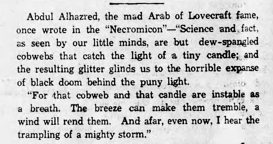 My husband and I were bosom friends of the late weird writer, Howard Phillips Lovecraft, who died March 15, 1937, in our city, and who lies sleeping in beautiful Swan Point Cemetery. One night, after reading an especially weird manuscript aloud to us, he remarked that he believed the human brain was practically indestructible. . .that (who [k]new?), the brain MIGHT keep on functioning even after death. . .at least, it was a subject worth thinking about!