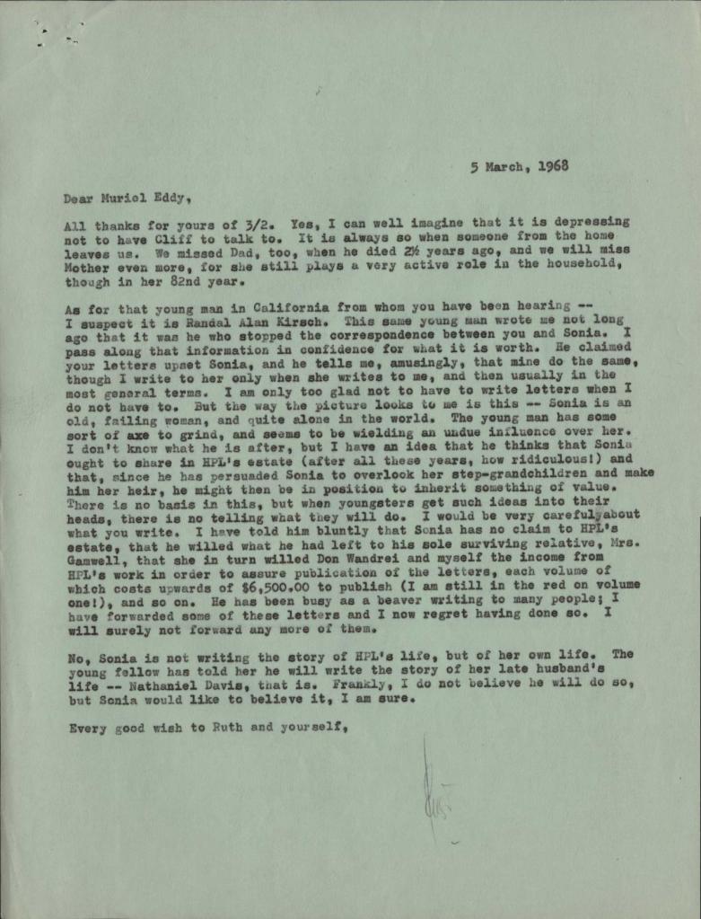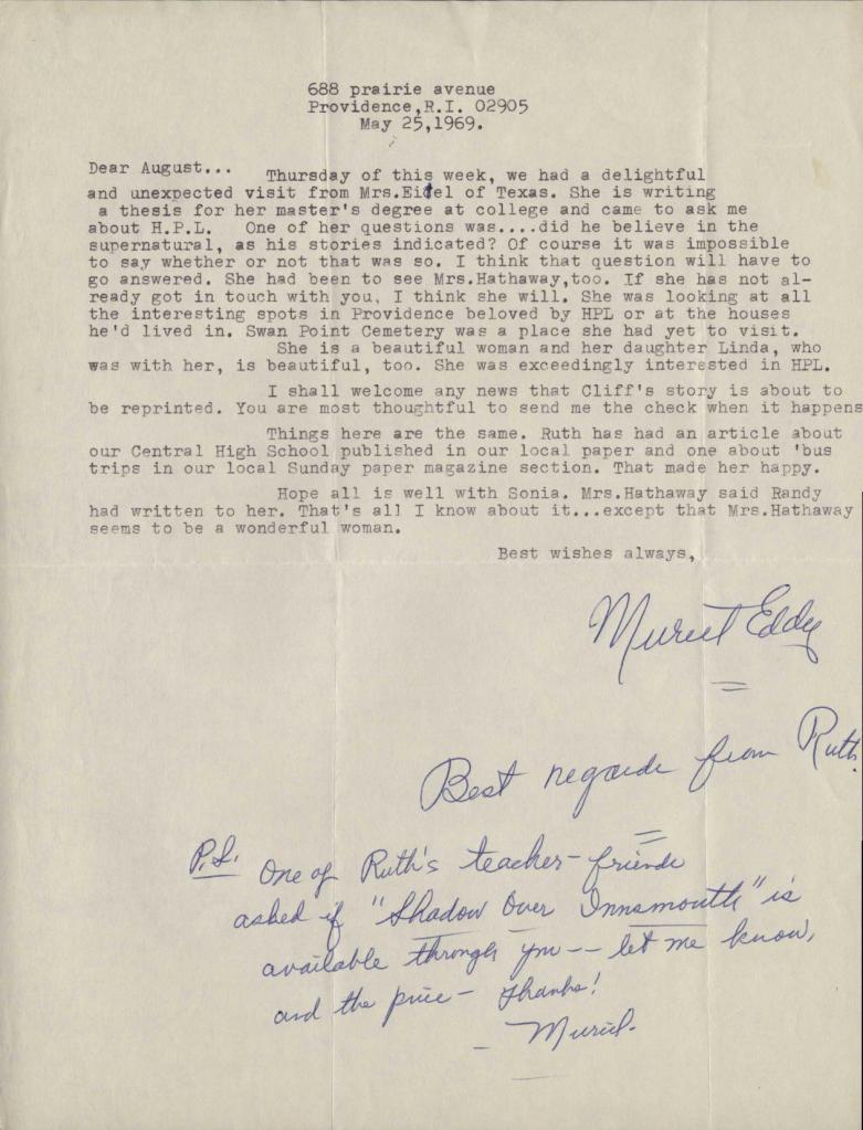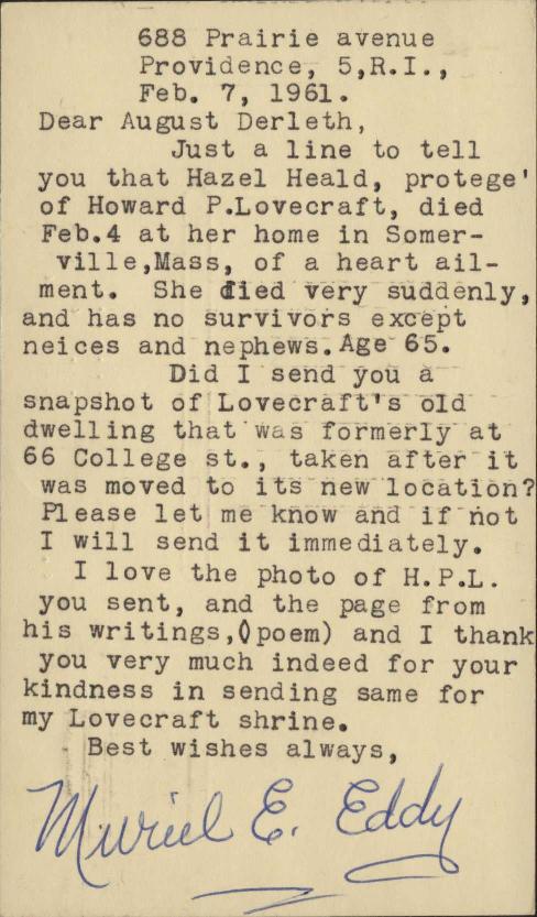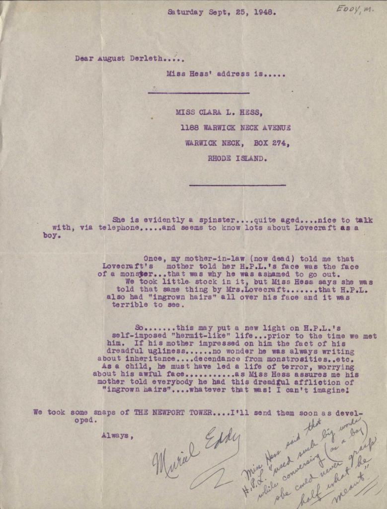 Notes: While they never met, Muriel Eddy and Sonia H. Davis did develop a correspondence after Sonia’s memoir on Lovecraft appeared in the Providence Journal.