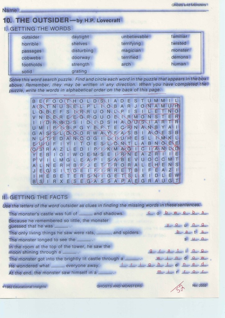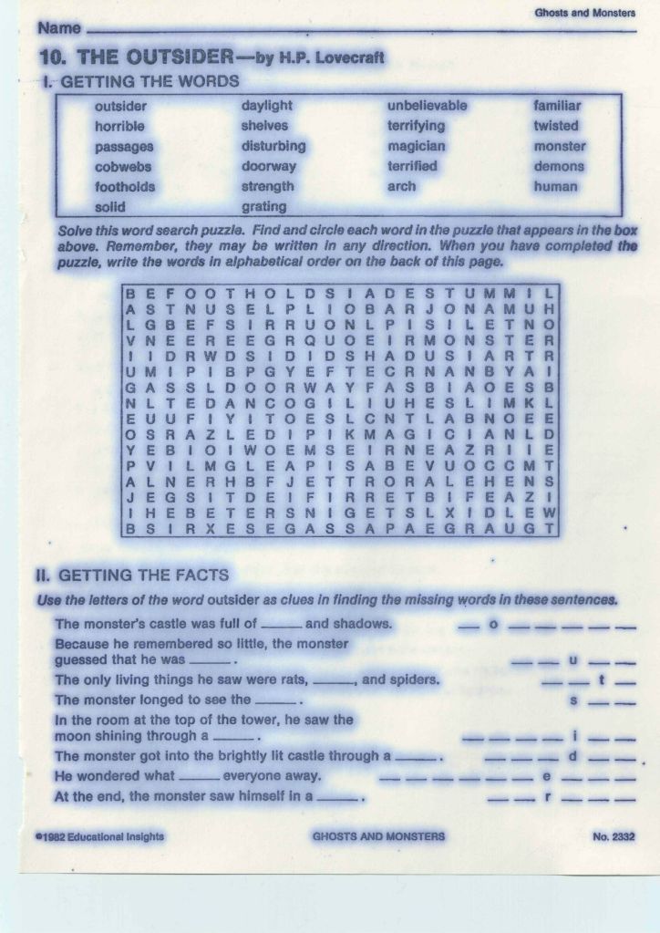 My hubby and I have one entire room lined with weird and fantastic books and magazines. We were intimate friends of the late author of the weird and uncanny, H. P. Lovecraft. We spent many pleasant nighttime hours with this fantastic man, listening to him read his manuscripts aloud under flickering gaslight. This was in the early ’20s, when everybody didn’t have electricity in their homes! Nights seemed darker, then . . . and as H. P. L. loved darkness, we three reveled in it, as we pictured monsters, hobgoblins, shapeless creatures of his own imagination and witches steeped in witchcraft, while Lovecraft nibbled on a chicken leg and enjoyed our hospitality!