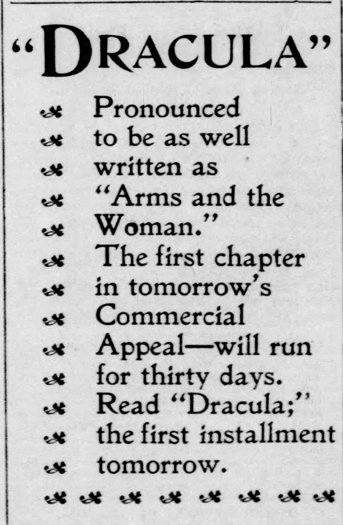 The serialization of Dracula in the Commercial Appeal for Memphis, Tennessee was announced in the 13 June 1899 issue, on page 1:
