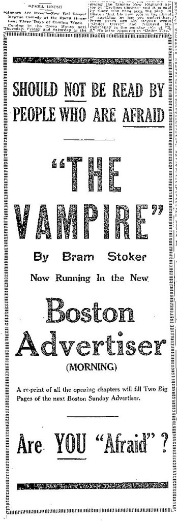 Some of these have been discussed by previous scholars: John Edgar Browning in The Forgotten Writings of Bram Stoker listed serialization in the Washington Times (1917-1918) and the Charlotte Daily Observer (1899), drawing on information from the Bram Stoker Estate and researcher David J. Skal. Browning also mentions advertisements in the Fitchburg Daily Sentinel, Lowell Sun for a serial in the Boston Advertiser (1921); I have not been able to find an online archive for the Advertiser yet, but can confirm the ads.