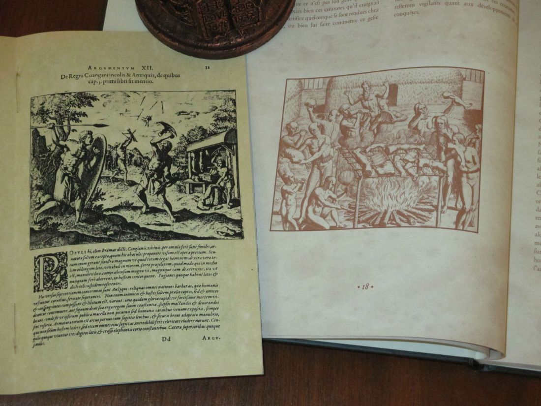Pigafetta translated Lopez’ account from Portuguese into Italian, expanded it to cover more of Africa, and in 1591 published it in Rome as Relatione del Reame di Congo et delle circonvicine contrade tratta dalli scritti & ragionamenti di Odoardo Lopez Portoghese. The book proved popular and was translated into many more languages. The German edition of 1597 included plates by the famous engravers Johann Theodor De Bry and his brother Johann Israel De Bry. Although the two never traveled beyond Europe, their engravings of the exploration of the Americas and Africa would become infamous—not the least because of their elaborate illustrations cannibalism and other practices which the European explorers claimed the indigenous peoples practiced.