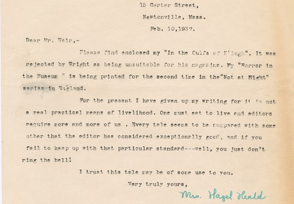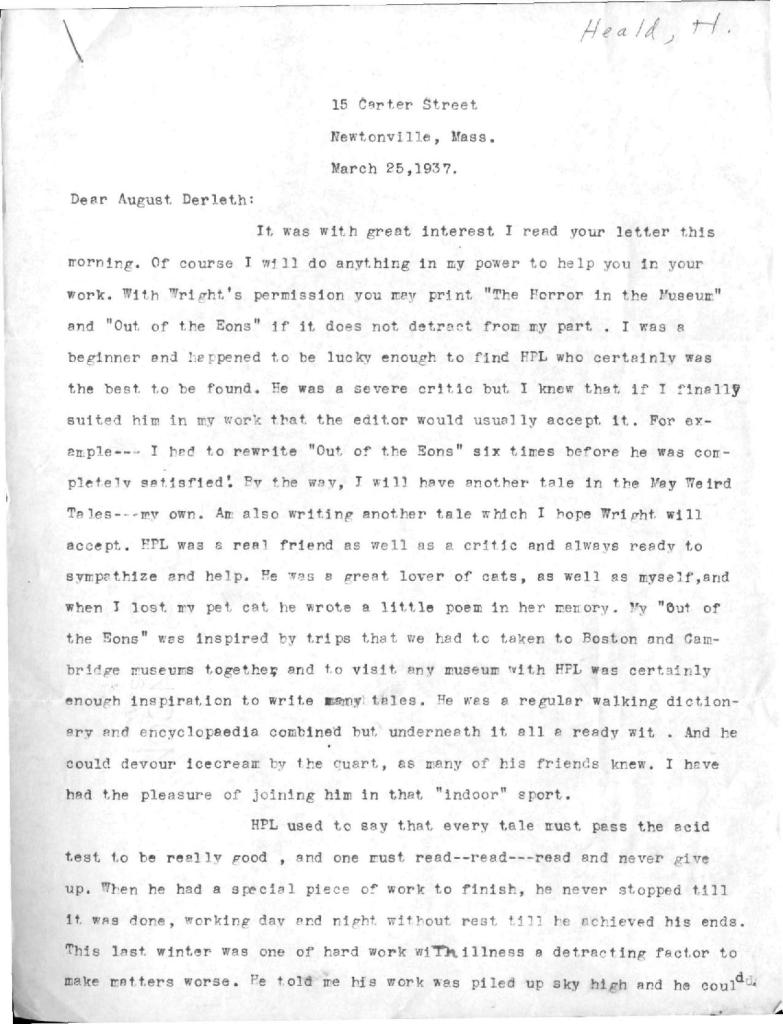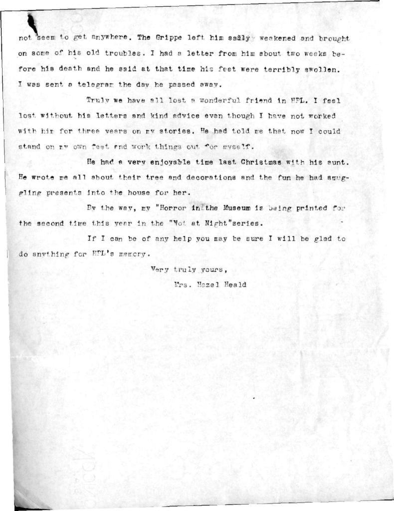 This first period of correspondence appears to have ended in May 1937, shortly after the June 1937 issue of Weird Tales came out, filled with letters about Lovecraft from grieving fans, including one from Hazel Heald.
