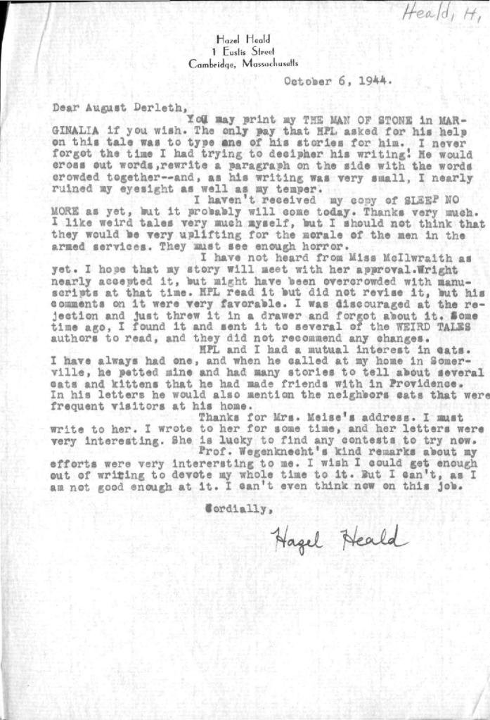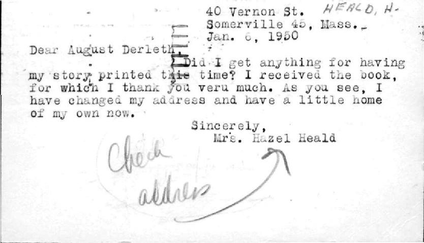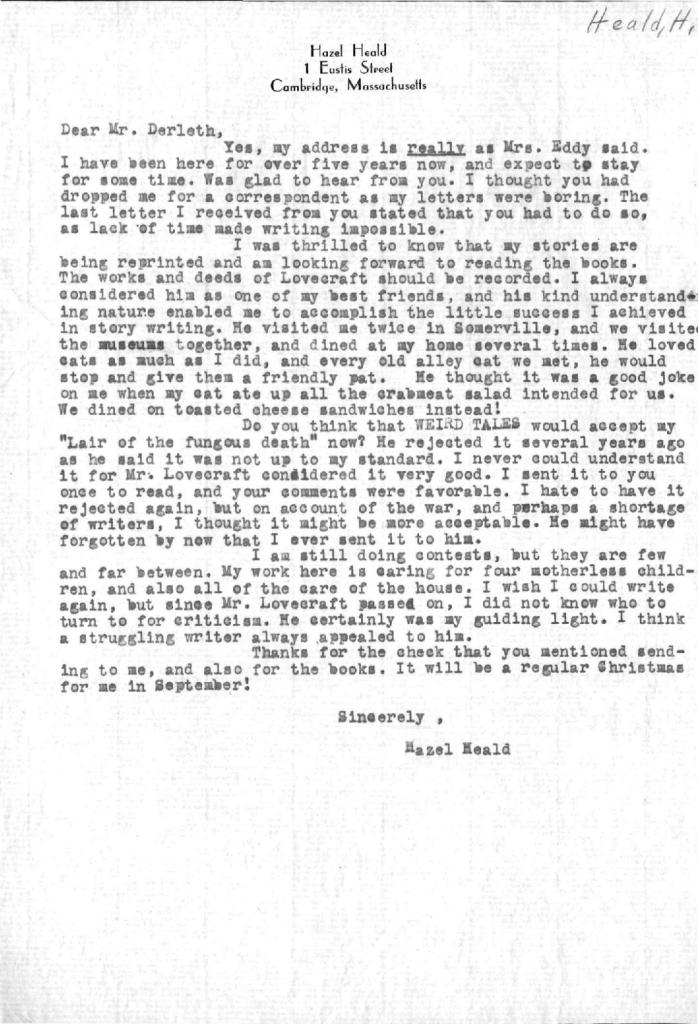 We can only speculate, but it seems likely that there was little more that Hazel Heald could offer Derleth in terms of reminiscences of Lovecraft or fiction revised by him; and he for his part could not (or would not) revise her stories and try to agent them as Lovecraft had done.