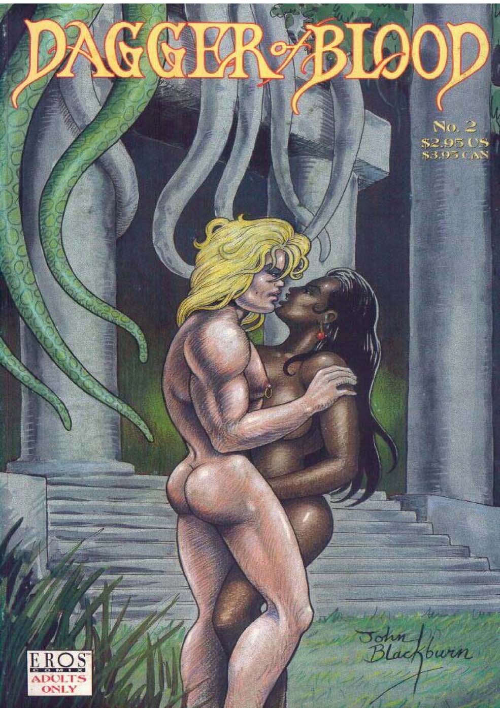 In the 1970s, comic writer and artist John Blackburn created the character Coley Cochran, a 19-year-old uninhibited bisexual character with a penchant for sex, violence, and the occult and antipathy to prudes and authority figures. In the late 80s/early 90s Blackburn self-published four books of Coley’s sex-drenched adventures, a combination of erotica, character-driven drama, and graphic violence. In the first book, Coley on Voodoo Island (1989), Coley is kidnapped and transformed into a sex god in a voodoo ceremony; this supernatural element would re-emerge periodically throughout Coley’s adventures, such as Breathless (1991), which includes an adventure at a ruined temple titled “Flowers of Evil.”