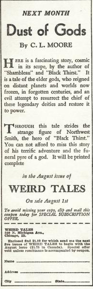 Farnsworth Wright, editor of Weird Tales, was apparently pleased with what he had read and published so far, and another Moore story would be published just a few months later.