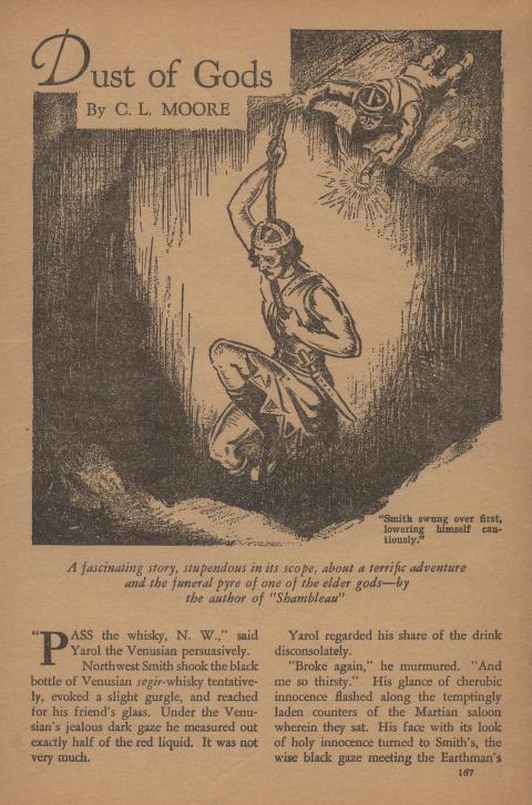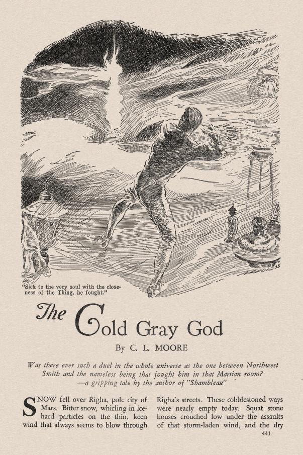 Was there ever such a duel in the whole universe as the one between Northwest Smith and the nameless being that fought him in that Martian room?—a gripping tale by the author of “Shambleau” —Epigraph to “The Cold Gray God” in Weird Tales (Oct 1935)