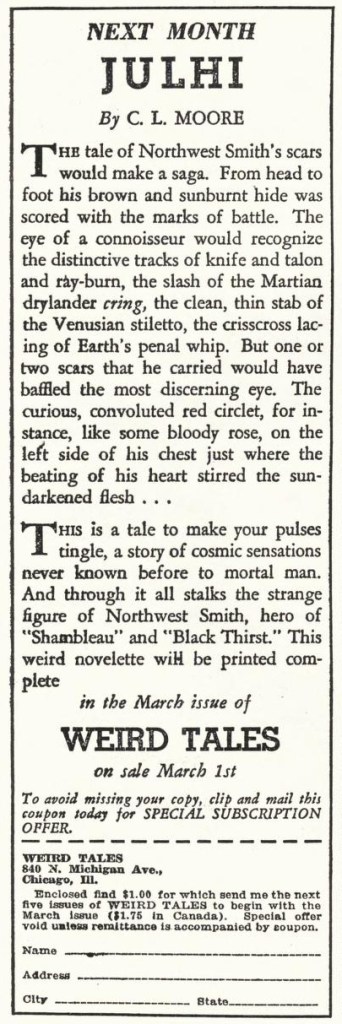 Another weird and thrilling tale about Northwest Smith, by the author of “Shambleau”—an astounding story of ultimate horror. —”Coming Next Month,” Weird Tales Mar 1934