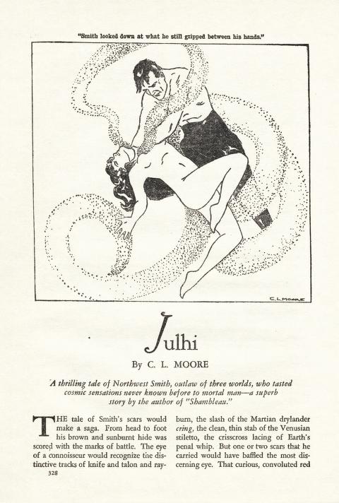 The fifth published adventure of Northwest Smith, “Julhi,” seems another concession to Farnsworth Wright’s demand for more Northwest Smith stories than a tale that demanded to be told. Moore even provided one of her own illustrations for the story: