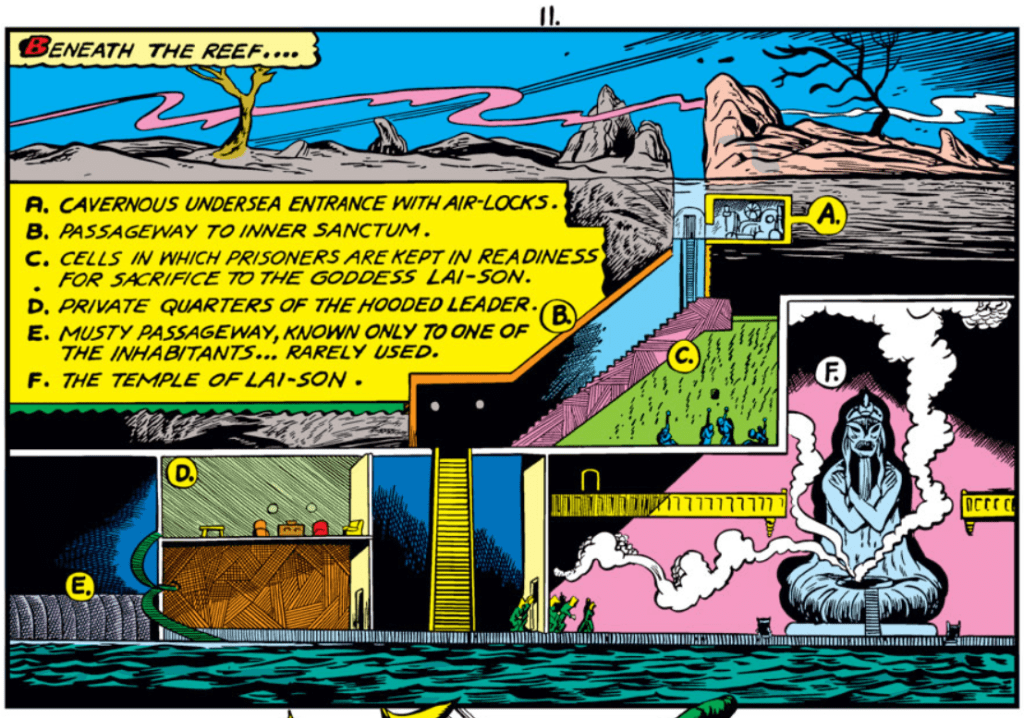 This is a long way to say that Raule had a free hand when it came to the script, and Jaunfra MB and Alejandro TM could exercise their imagination however they pleased when envisaging Crom and his apotheosis. What they ended up going with was a somewhat stereotypical quest narrative: Crom goes hunting for four artifacts of power, from the ruin of the first city, long sunken to the lairs of various monsters.