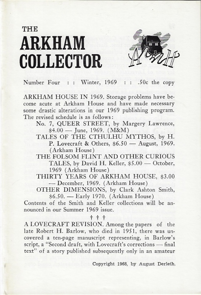 To support and promote Arkham House, co-founder and editor August Derleth tried innumerable ways to get the word out about the press, publishing a vast array of ephemera to advertise the wares, attract notice from potential customers, and explain about delays or difficulties. On two occasions, Derleth attempted a regular journal to supplement and advertise the small press: the Arkham Sampler (1948-1949) and the Arkham Collector (1967-1971), both of which contained a similar mix of content: news about Arkham House and its publications, book reviews, original fiction and poetry, short essays by or about Lovecraft, etc.