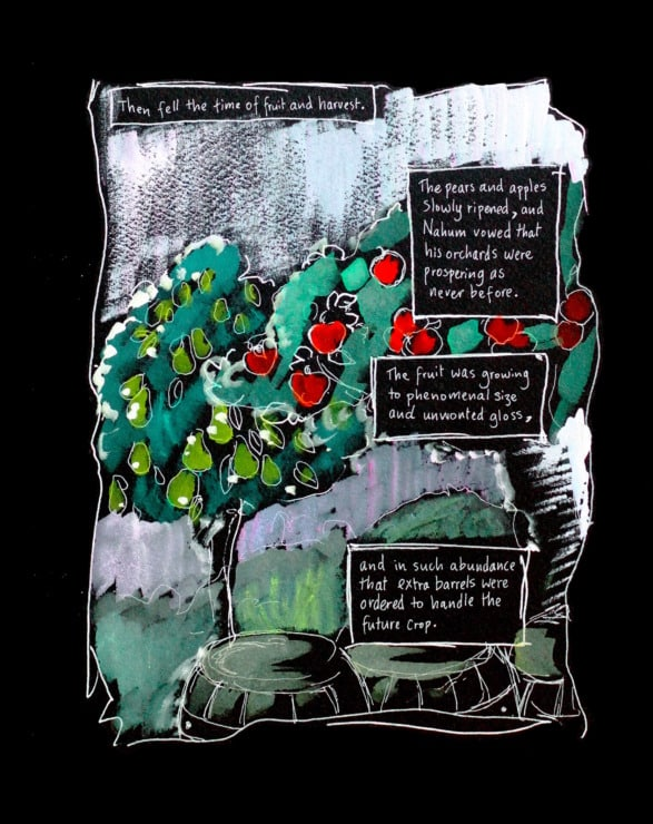 Barkat’s style isn’t a demonstration of technical excellence in the same sense of Gou Tanabe’s The Colour Out of Space (2025), nor does it have the minimalist book-as-object approach of Amy Borezo’s The Colour Out of Space (2016). What she has is a loose, sketchy but heavily detailed pencil that captures a certain underground aesthetic, the rawness of the art adding a certain texture to the text, especially with the use of mixed media (primarily watercolors) to add color. As with Alberto Breccia’s Cthulhu Mythos adaptations, the result is a more profound experience than either the art or the text would accomplish on their own.