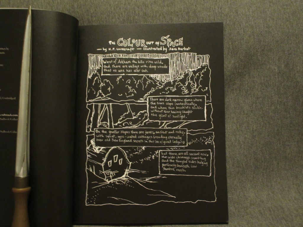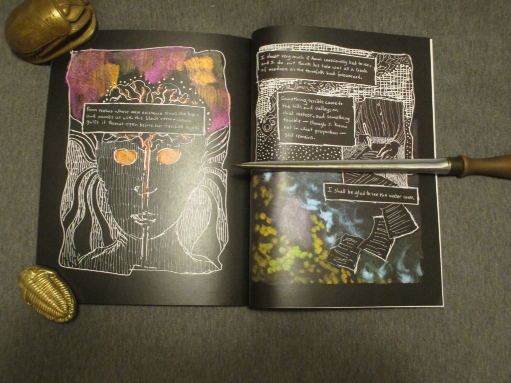 In 2016, artist Amy Borezo published a very limited illustrated edition of H. P. Lovecraft’s story “The Colour Out of Space.” To quote from Shelter Bookworks’ original page: